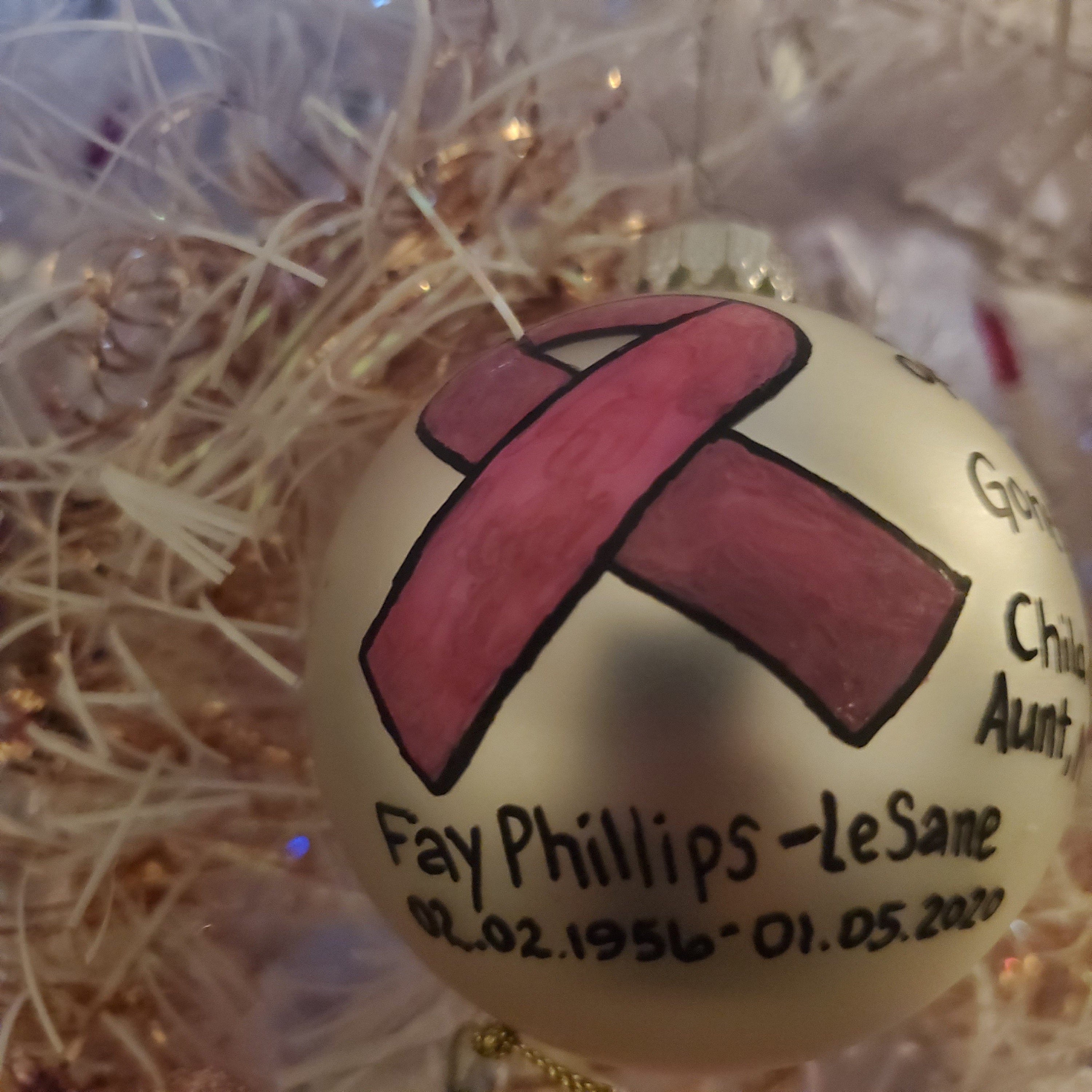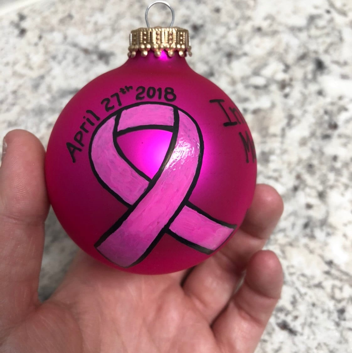 This beautiful pink ribbon can be customized for a cancer survivor, or be in loving memory of a loved one lost. Please indicate what message you would like alongside the pink ribbon. If you would like the ribbon to be added to a different colored bulb, simply add that variation during your order.
